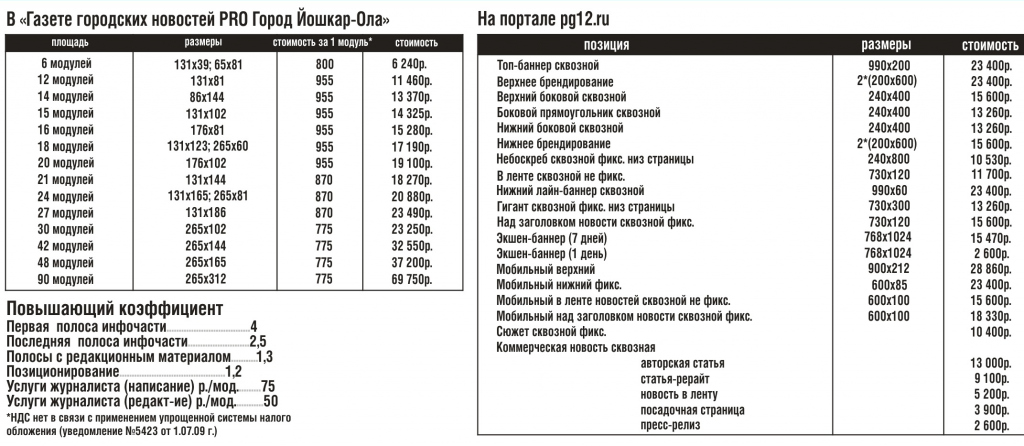 ИП Карелин Н.Ю. сообщает о готовности предоставить зарегистрированным кандидатам в депутаты Государственной Думы Федерального Собрания Российской Федерации восьмого созыва и зарегистрированным кандидатам в депутаты на Дополнительных выборах депутатов Государственного Собрания Республики Марий Эл седьмого созыва печатную площадь и услуги по размещению агитационных материалов в сетевом издании в СМИ газета «Pro Город» Йошкар-Ола» и портал pg12.ru для проведения предвыборной агитации на выборах по предоставленным расценкам.