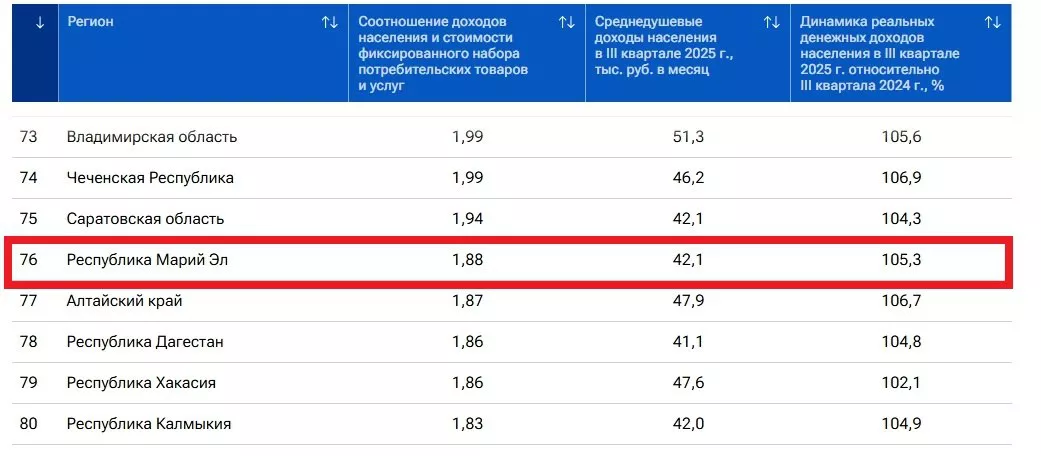 Республика Марий Эл заняла 76 место в рейтинге российских регионов по доходам населения, опубликованном к третьему кварталу 2025 года. Сообщается, что при расчёте учитывалось соотношение доходов жителей и стоимости фиксированного набора потребительских товаров и услуг, а также средний размер заработка за месяц.