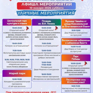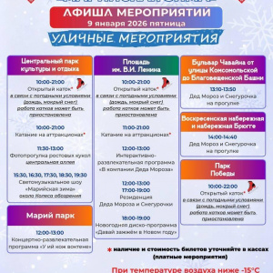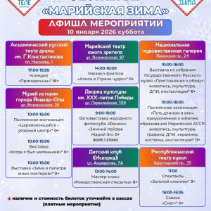 - Центральный парк культуры и отдыха: открытый каток 10:00-21:00, катание на аттракционах 10:00-21:00, фотопрогулка ростовых кукол по центральной аллее 11:30-13:00, светомузыкальное шоу «Марийская зима» около Колеса обозрения 15:30, 16:30, 17:30, 18:30, 19:30