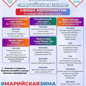 В Йошкар-Оле проходит фестиваль «Марийская зима» с программой мероприятий на 9, 10 и 11 января. Жителей и гостей столицы ждут уличные катки, концерты, театральные постановки, выставки и развлекательные программы.