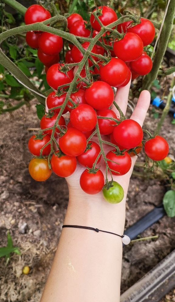 Виноградный гигант оправдал свое название – огромные кисти и крупные для черри ягоды. Вкус насыщенный, томатный, хотя по сладости уступает другим сортам. Главная сложность – растению нужно много места, сила роста огромная. Опытные огородники рекомендуют высаживать такие томаты сбоку каждой грядки по одному кусту и вести не больше двух стволов.