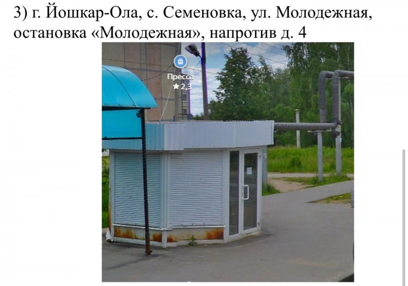 В Йошкар-Оле обнаружены самовольно установленные торговые объекты по трём адресам: ул. Подольских курсантов у д. 14, ул. Прохорова напротив д. 46, и в с. Семёновка на ул. Молодёжной, напротив д. 4 – у остановки «Молодёжная». Об этом сообщили в пресс-службе администрации города.
