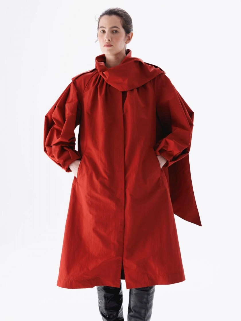 Центральным образом коллекции стал плащ-пыльник с асимметричным воротником, который переходит в длинный шарф-галстук. Модель представлена в трёх расцветках, для её пошива использованы архивные ткани домов Hermès, Dries Van Noten и Bottega Veneta. Ранее бренд уже привлекал к себе внимание сочетанием марийской вышивки с архивными тканями мировых модных домов - коллекция с орнаментом из фондов Национального музея Республики Марий Эл была показана в Москве.