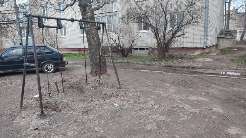 Среди жалоб жильцов и плохо благоустроенный двор. Вдали одиноко стоит разбитая металлическая качель, сидения отсутствуют. На качели качаться ребенку нельзя и даже опасно. Во дворе нет ни песочниц, ни скамеек. Нет зон для занятия спортом: турников, игровых площадок. Одним словом, во дворе гулять страшно и бесполезно. С другого торца где-то можно увидеть обвалившаяся входную в жилое помещение плиту, замененную на деревянный настил.