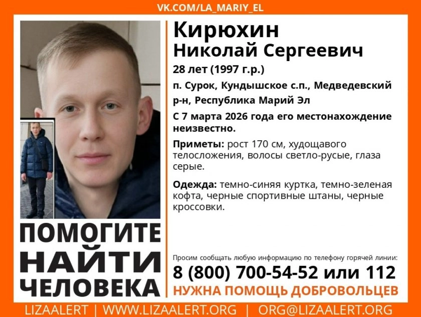 Кирюхин Николай Сергеевич, 28 лет, пропал с 7 марта 2026 года. Последнее известное место жительства — посёлок Сурок, Кундышское сельское поселение, Медведевский район, Республика Марий Эл. Об этом сообщает поисково-спасательный отряд "Лиза Алерт".