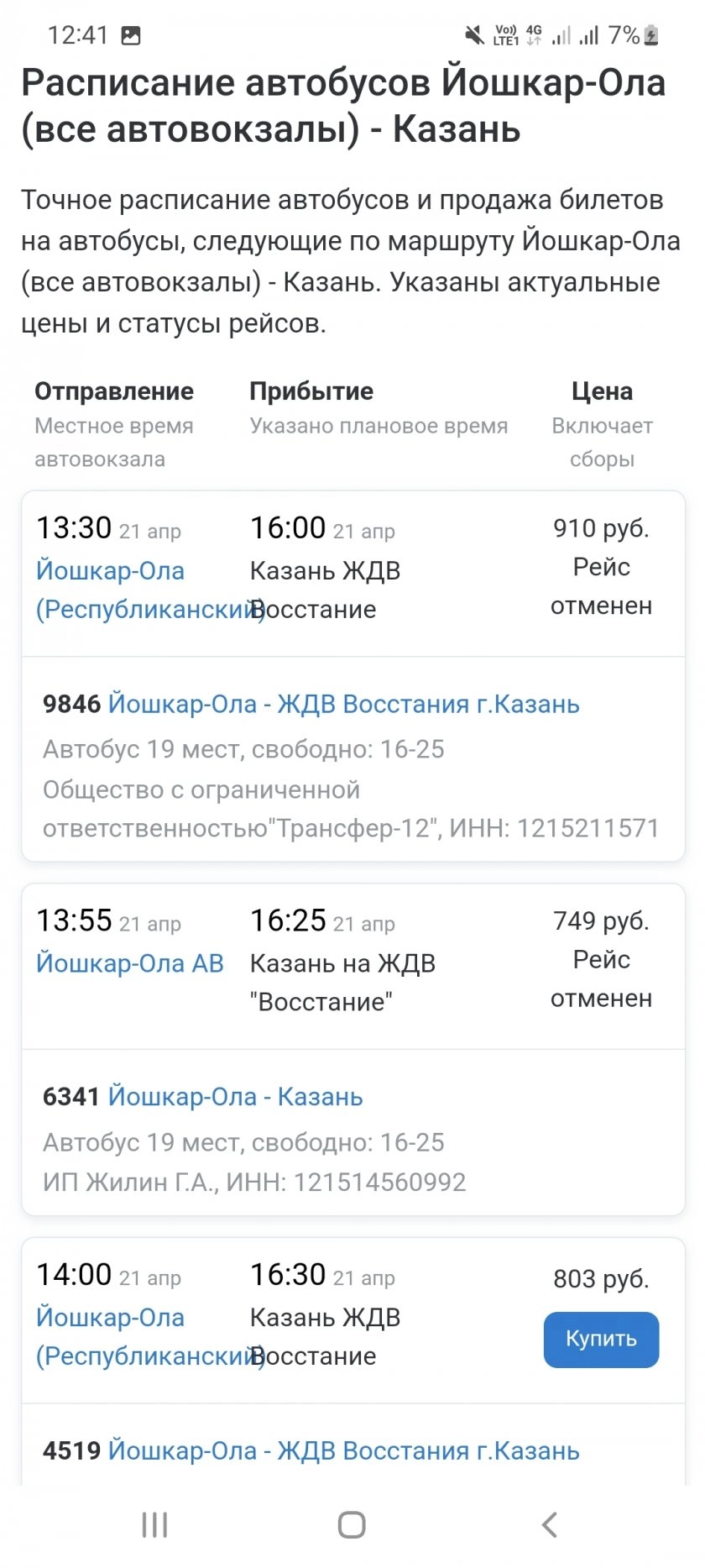 Во вторник несколько автобусных рейсов из Йошкар-Олы в Казань и Чебоксары не вышли на линию из‑за плохой погоды. Пассажирам рекомендуют заранее уточнять, идет ли их рейс, чтобы не тратить время на поездку до автовокзала. Об этом сообщает группа "Внешний транспорт Марий Эл".
