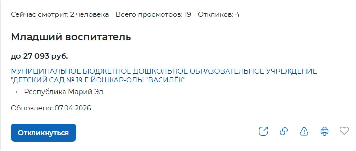 Детский сад № 19 г. Йошкар-Олы «Василёк» ищет человека, который будет убирать группу по санпинам, помогать воспитателям, следить за детьми. Требуется среднее профессиональное образование, справка об отсутствии судимости, аккуратность и ответственность. Зарплата — чуть больше 27 тысяч рублей. Для сравнения: помощник воспитателя в среднем по России получает около 21–24 тысяч рублей, и это одна из самых низких ставок в стране. Марий Эл не исключение.