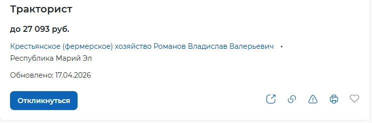 Крестьянское хозяйство Романова ищет тракториста с опытом от года. Человек должен уметь управлять трактором и самостоятельно его обслуживать и ремонтировать. Без сельского труда не будет еды на столах — но оплата этого труда остаётся символической. Тракторист и другие операторы сельскохозяйственной техники формально входят в список дефицитных профессий России 2026 года.