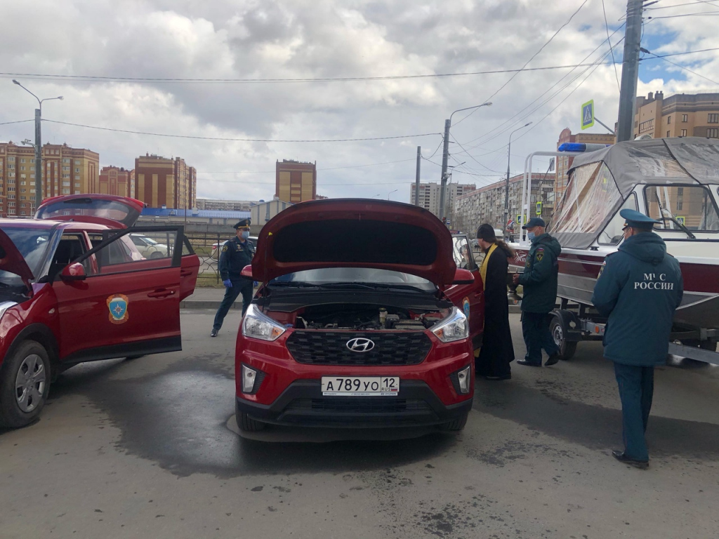 Сегодня около 12:30 дня у Арены Марий Эл сотрудникам МЧС вручили новую технику. На парковке стояли автомобили УАЗ Патриот, пара Hyundai Creta, а также один катер. Помимо этого, прошла церемония освящения новой специализированной техники.