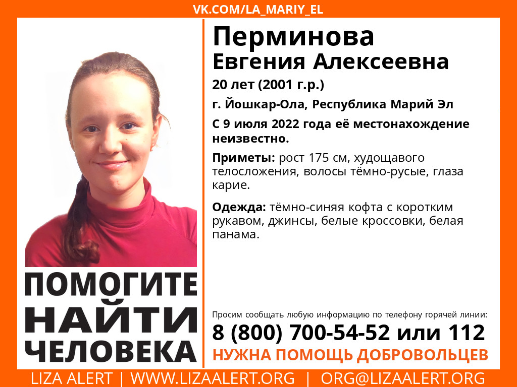 11 июля "ЛизаАлерт" сообщила о пропаже 20-летней Перминовой Евгении Алексеевны из Йошкар-Ола.