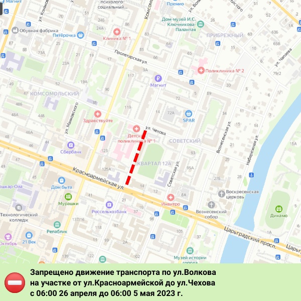 Часть улицы Волкова перекрыта на время ремонтных работ. Ограничения коснулись участка от улицы Красноармейская до улицы Чехова. Запрет на движение транспорта начал действовать с 6:00 26 апреля. Он будет снят 5 мая в 6:00.