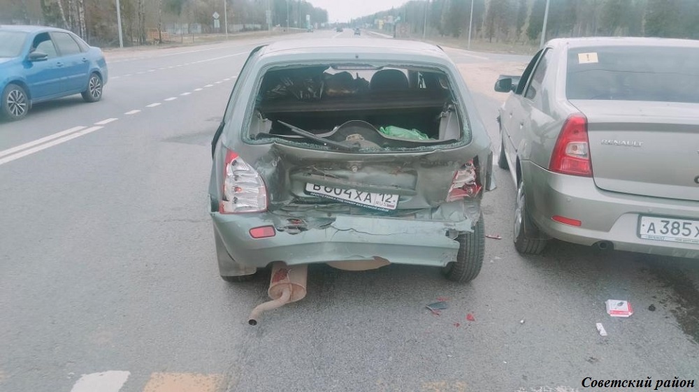 Днем в Советском районе на 41 км дороги Йошкар-Ола - Уржум 52-летняя водитель Renault не выдержала безопасную дистанцию и столкнулась с движущейся впереди машиной Лада-1117 по управлением 22-летнего водителя. В результате столкновения пострадала 47-летняя пассажирка отечественной машины.