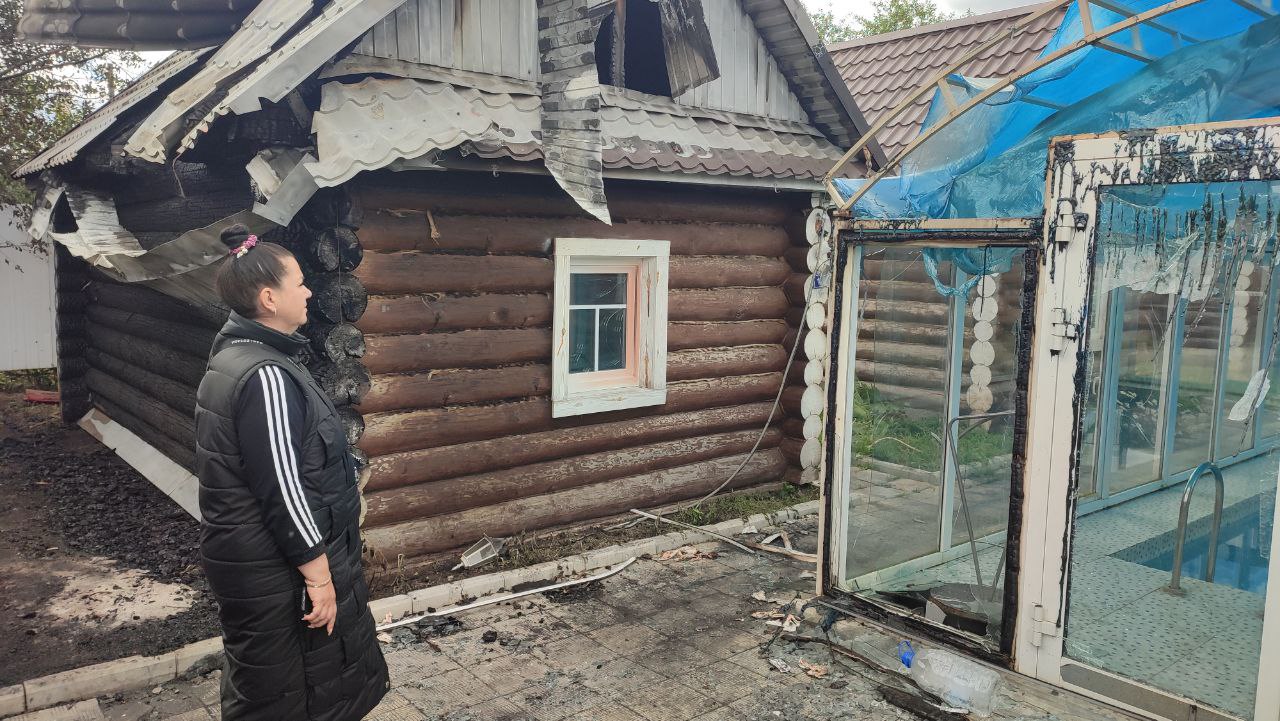 Управляющая “Венецией” показывает масштаб причиненного ущерба.Пострадал бассейн на улице глубиной 1 метр 80 сантиметров. Его ограждения все треснули от температуры и покрылись копотью и сажей. В результате возгорания сгорели две бани, летняя терраса и задеты два гостевых домика.