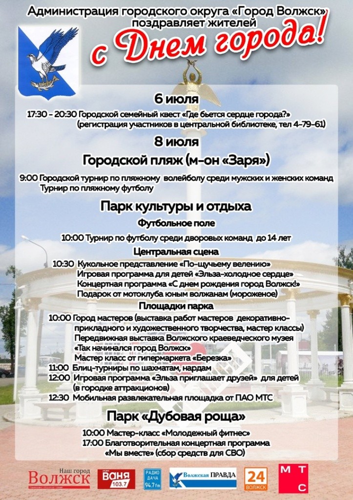 Тем не менее 6 июля жители города смогут пройти квест”Где бьется сердце города”, посвященный истории Волжска. Жители смогут узнать больше о родном городе и получить интересные призы. Командам будет необходимо пройти несколько испытаний и показать свои знания об истории Волжска. Мероприятие начнется в 17:30 возле краеведческого музея.