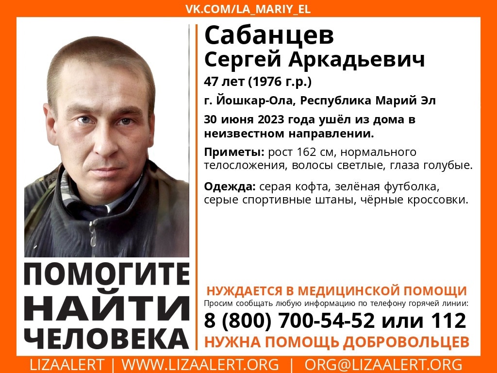 В Марий Эл ищут пропавшего йошкаролинца Сергея Сабанцева. 30 июня он ушел из дома в неизвестном направлении.