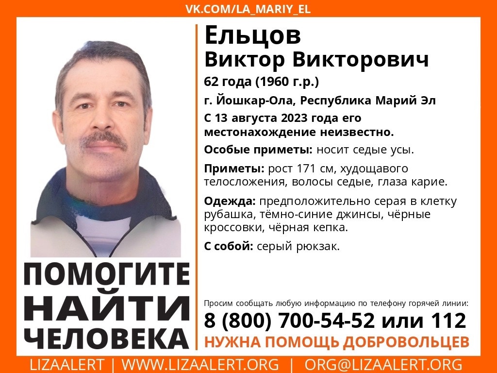 В Марий Эл разыскивают 62-летнего йошкаролинца Виктора Ельцова. С 13 августа его местонахождение неизвестно.