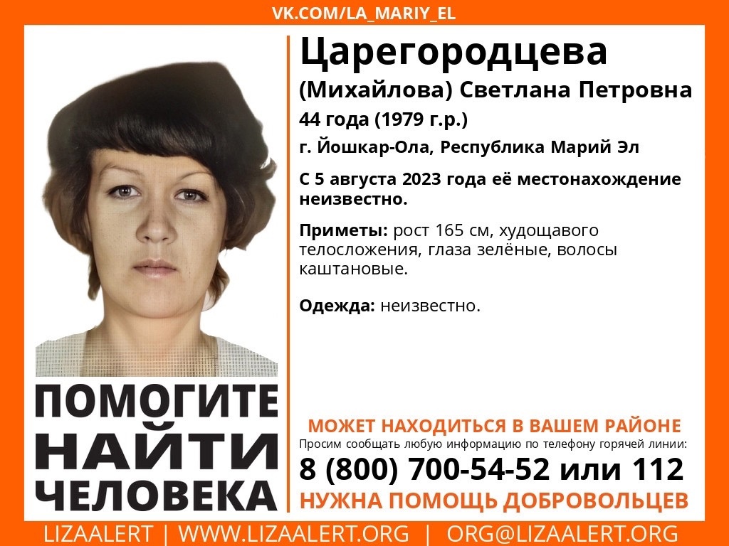 В Марий Эл разыскивают пропавшую 44-летнюю йошкаролинку Светлану Царегородцеву (Михайлову). С 5 августа ее местонахождение неизвестно.