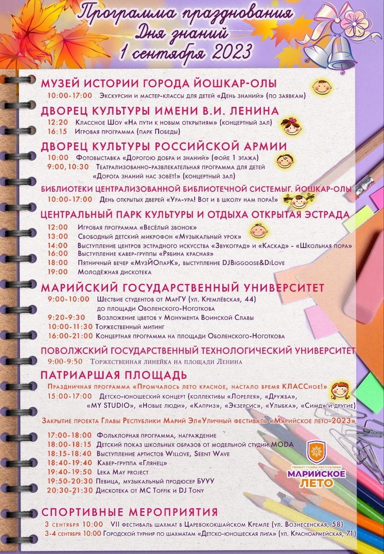 1 сентября Йошкар-Ола вместе со всей страной встретит День знаний. Для йошкаролинцев и гостей столицы подготовили праздничную программу: