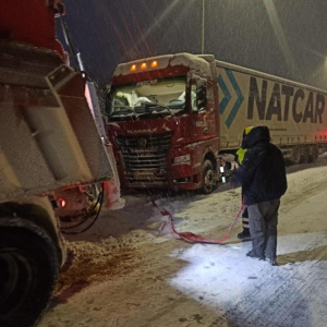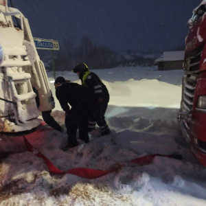 Еще один случай произошел в Волжске на улице Промбазы. Там забуксовала фура, также она не смогла проехать сложный заснеженный участок. На помощь поспешили автоинспекторы. Они подцепили грузовой автомобиль на трос к патрульной машине и протащили фуру.