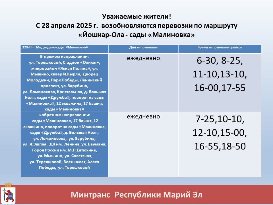С 28 апреля в Республике Марий Эл возобновляется автобусное сообщение по маршруту Йошкар-Ола – сады «Малиновка». Этот шаг стал ответом на многочисленные обращения садоводов и жителей поселка Медведево, которые просили обеспечить транспортное сообщение к началу сезона. Об этом сообщает Юрий Зайцев в своем телеграм-канале.