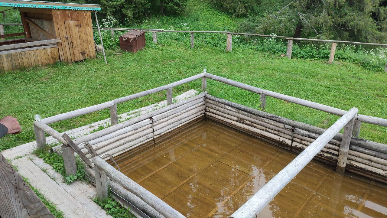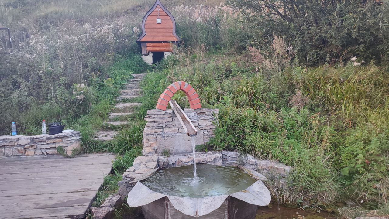 Баня на роднике, созданная Антоновым и его семьей, уникальна тем, что вода по желобам течет прямо в парилку. Далее она стекает в огромный бассейн, который сделан из чистого дерева. Объем воды в нем впечатляет - 90 тонн. Около родниковой бани стоят отреставрированные конопляные колодцы. Раньше в деревне там замачивали коноплю, для того чтобы плести льняные рубашки. Есть и обычный желоб, куда течет чистая родниковая вода для питья.